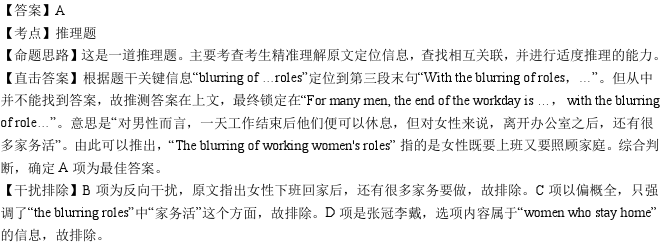 职场女性的模糊角色指的是A]她们既要在职场打拼又要照顾家庭[B]家也是她们休息的地方C]有太多家务等着她们去做D]她们很难离开办公室