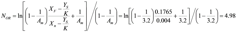 由于组分B、S可视为完全不互溶且分配系数为常数,故可用平均推动力法或式(10-26)求总传质单元数