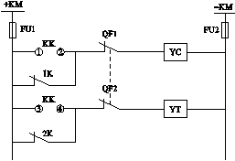图E-55KK—控制开关;YC—合闸线圈;1K—自动装置的合闸继电器触点;YT—跳闸线圈;2K—继电保护出口继电器触点; KM、KM—直流控制回路电源小母线